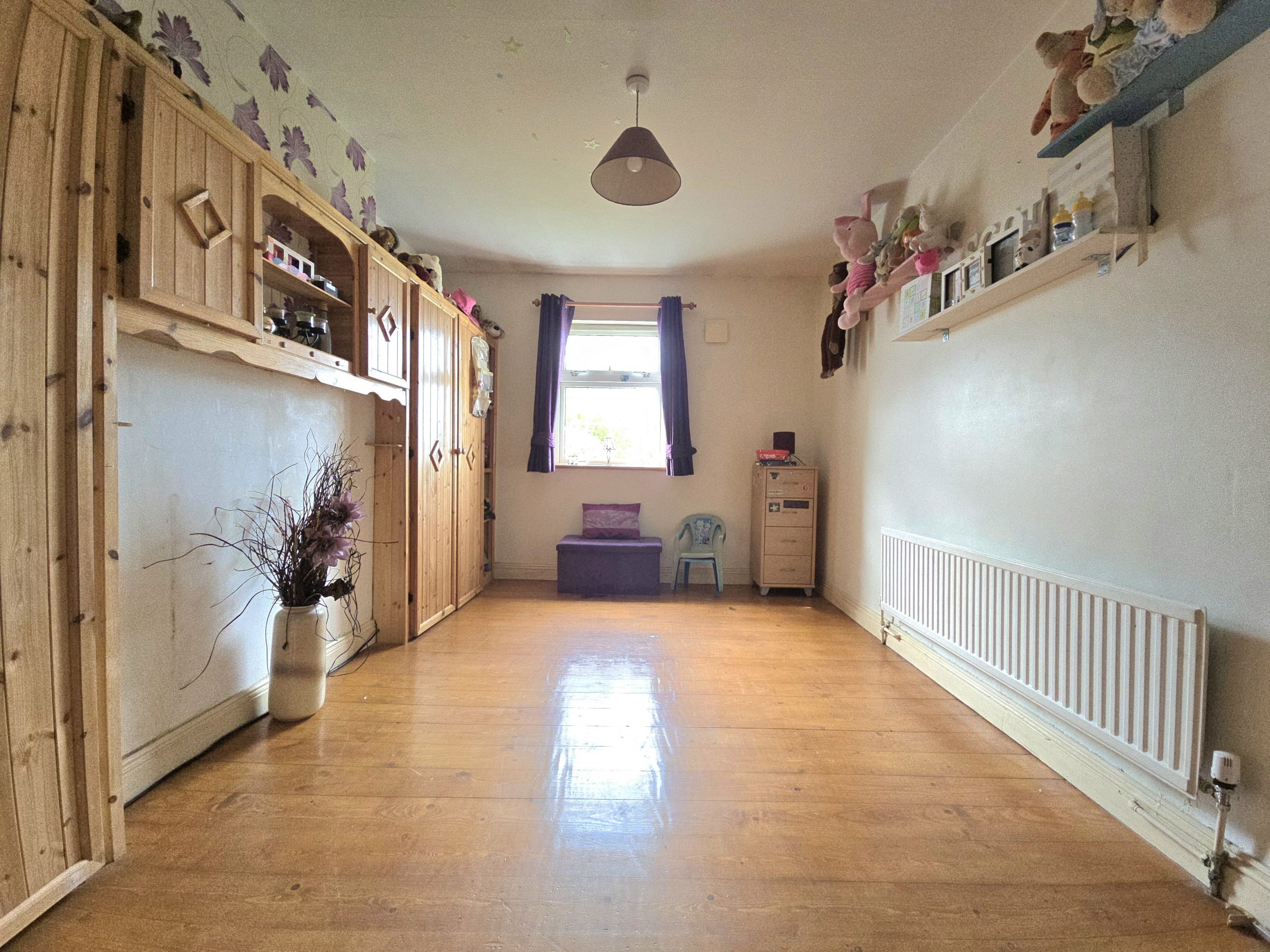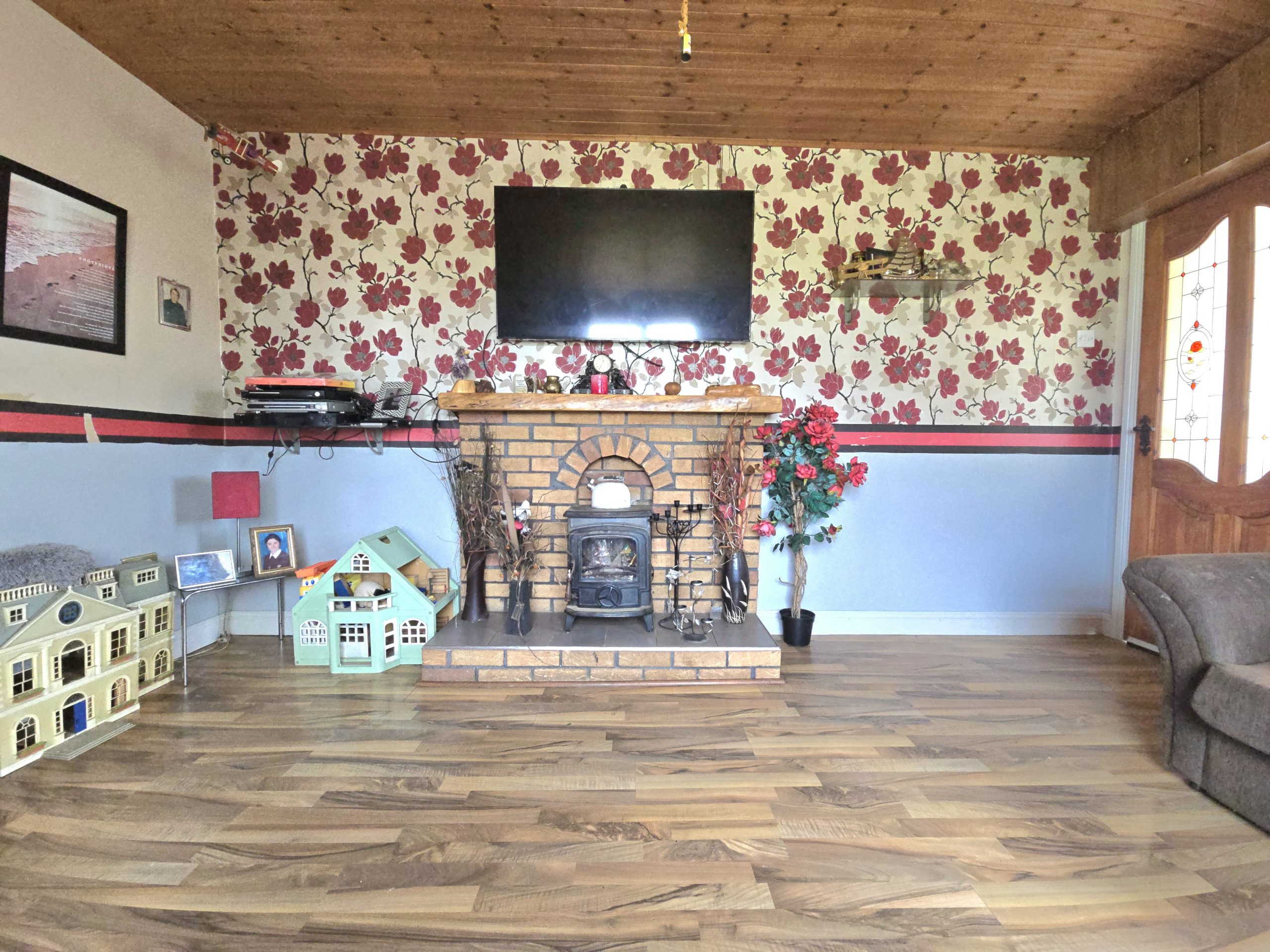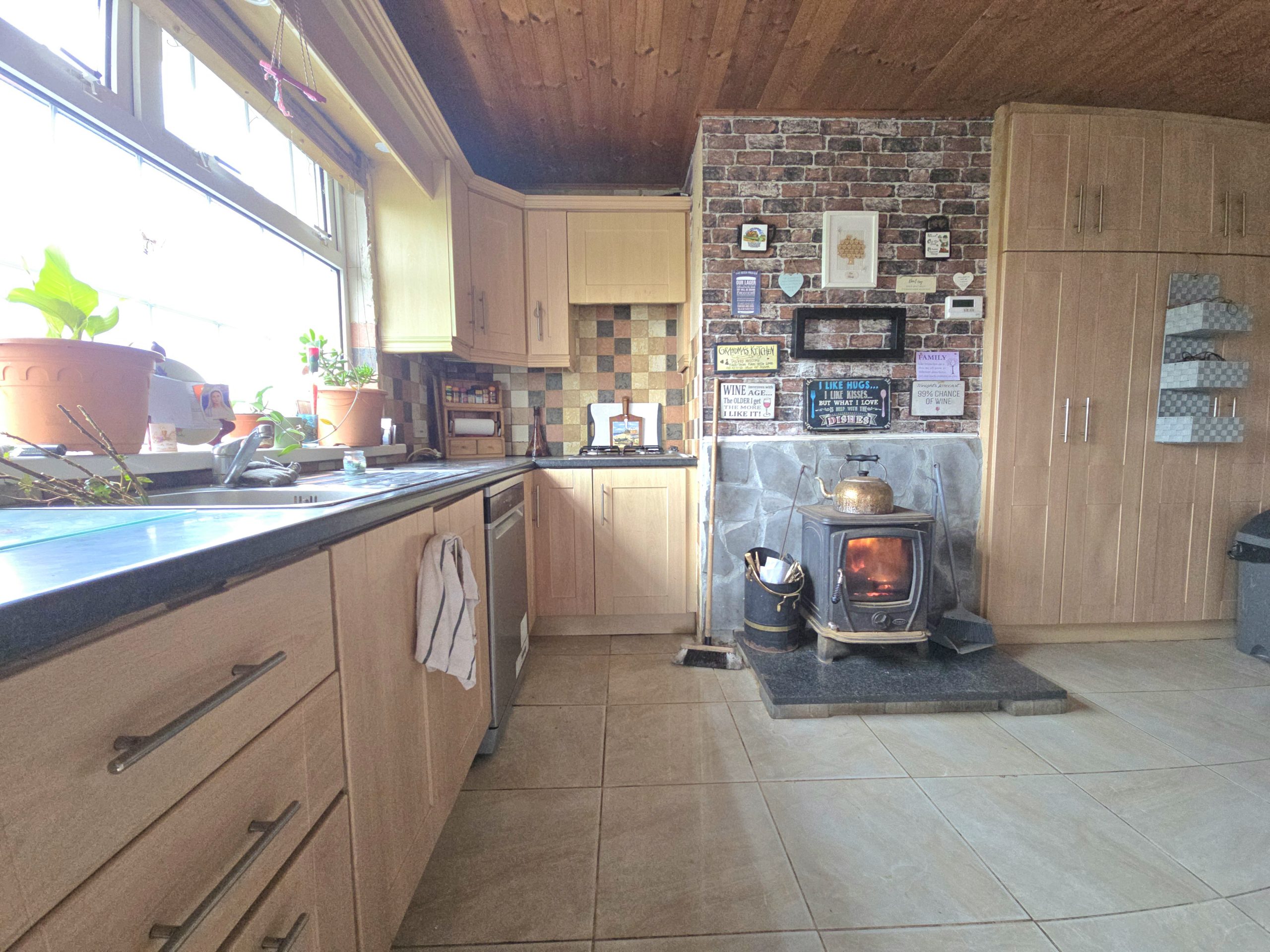 The property features a well-balanced interior with a welcoming living room complete with an exposed brick fireplace and multi-fuel stove, creating a warm and inviting atmosphere. The adjoining kitchen/dining area is bright and spacious, fitted with wood-effect units, tiled finishes, and a characterful fireplace, making it ideal for everyday family life and entertaining. The home benefits from wood-effect flooring throughout, generous bedroom accommodation with fitted storage, and a large family bathroom. Externally, the substantial site offers ample space for gardens, outdoor living, and future potential, while also providing excellent privacy and off-street parking.