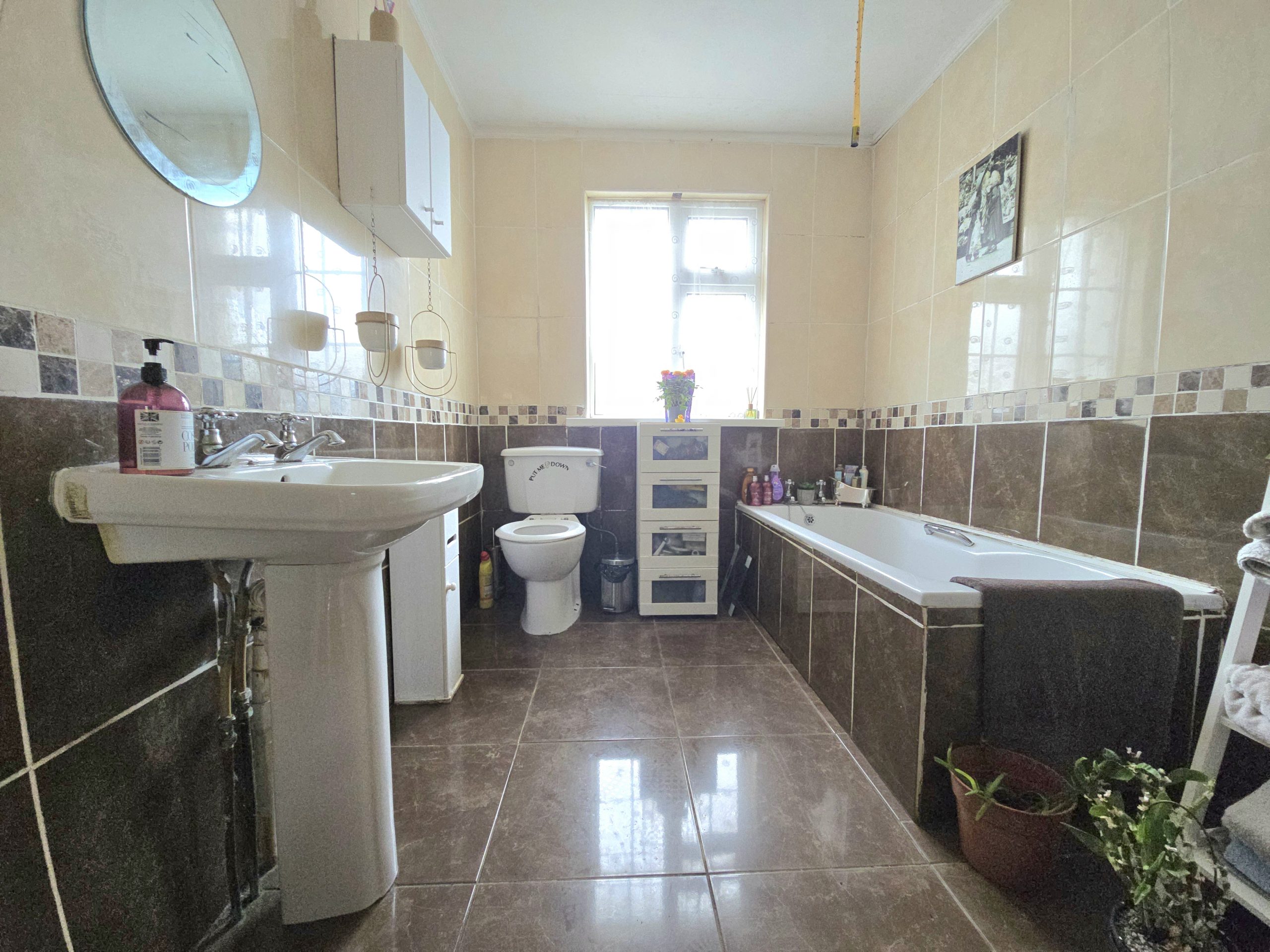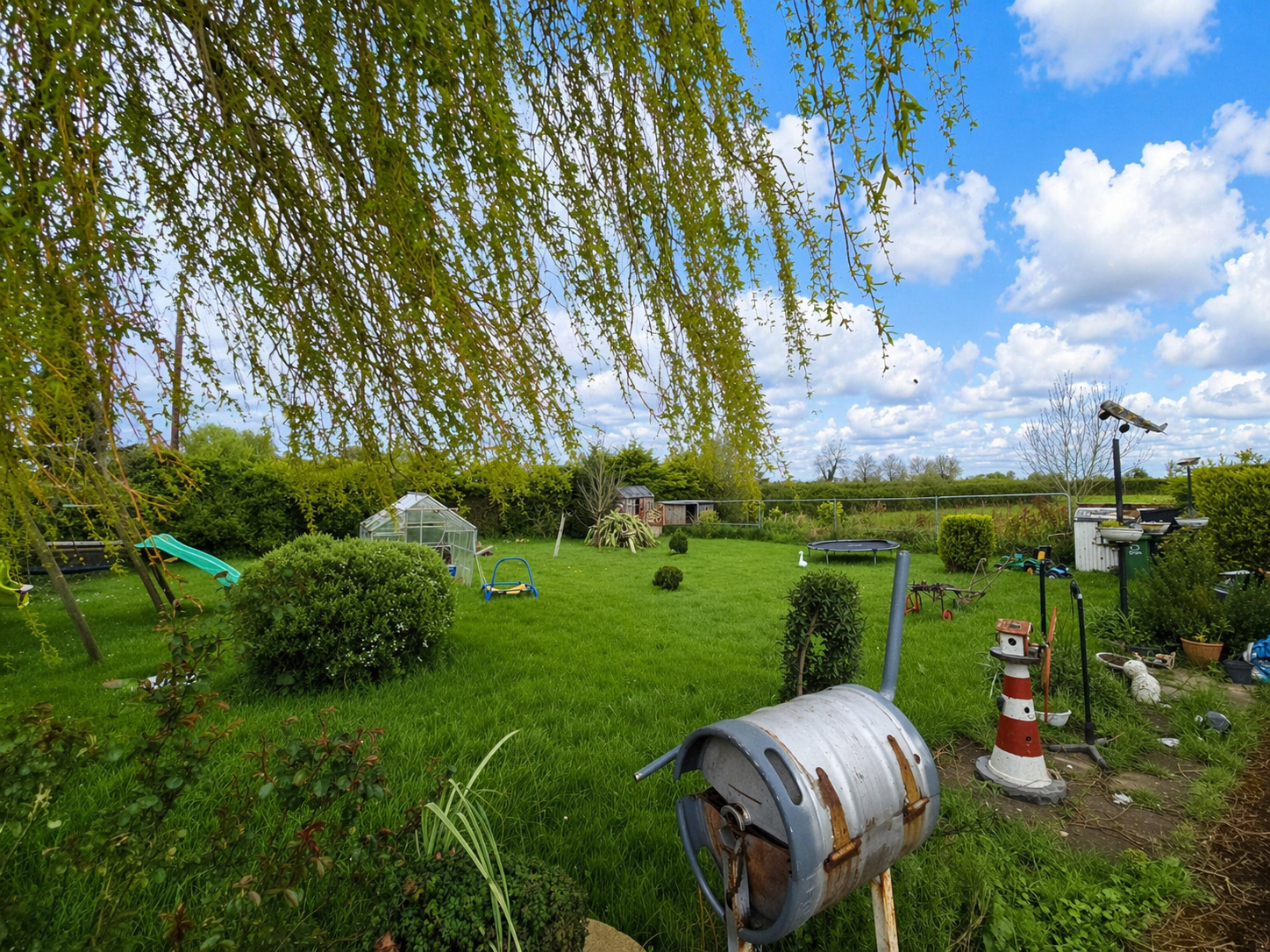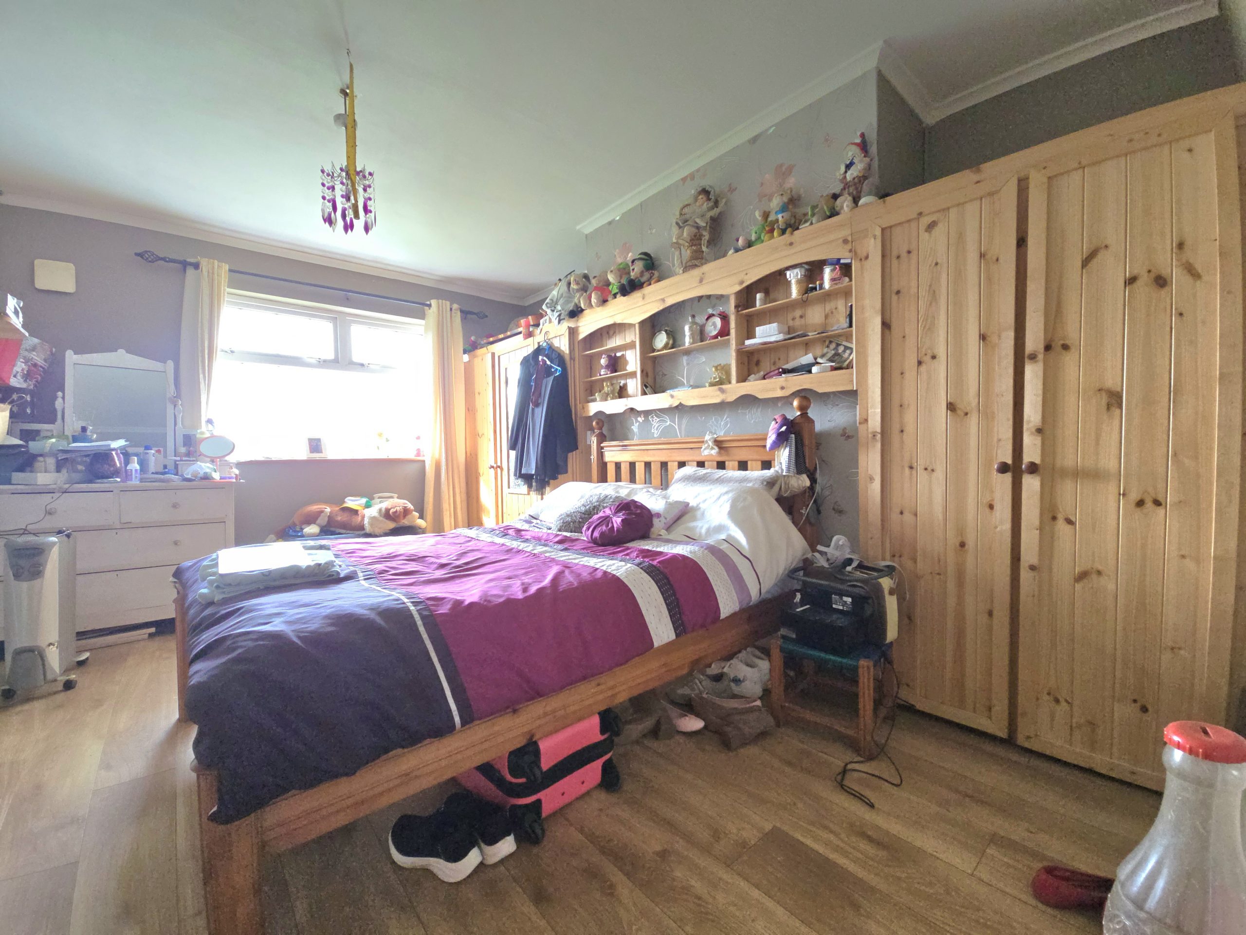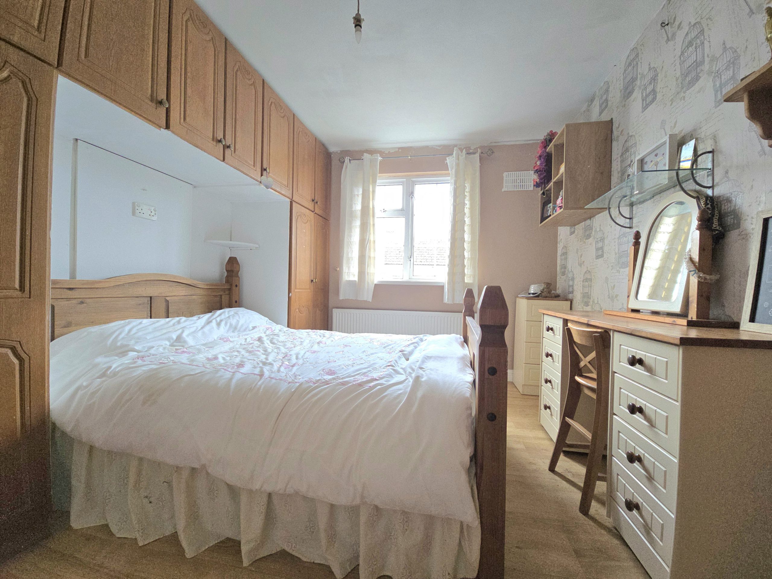 The property features a well-balanced interior with a welcoming living room complete with an exposed brick fireplace and multi-fuel stove, creating a warm and inviting atmosphere. The adjoining kitchen/dining area is bright and spacious, fitted with wood-effect units, tiled finishes, and a characterful fireplace, making it ideal for everyday family life and entertaining. The home benefits from wood-effect flooring throughout, generous bedroom accommodation with fitted storage, and a large family bathroom. Externally, the substantial site offers ample space for gardens, outdoor living, and future potential, while also providing excellent privacy and off-street parking.
